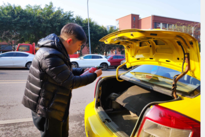 (圖為公司法人王然在認真檢查車輛的滅火器是否在合格期內(nèi))