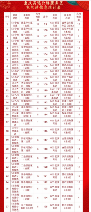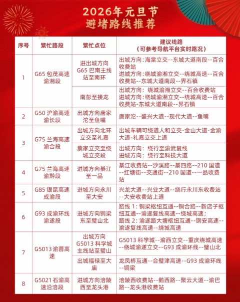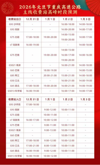 發(fā)表時間:2025-12-30 14:55作者:李嘉男來源:協(xié)會 元旦假期將至,為保障市民出行順暢,重慶高速集團發(fā)布2026年元旦假期高速公路出行服務(wù)指南,全面梳理假期時間、通行政策、車流預(yù)判、易擁堵節(jié)點及配套保障等關(guān)鍵信息,為公眾出行提供參考。 據(jù)悉,2026年元旦假期為1月1日0時至1月3日24時,共計3天。需要特別提醒的是,假期期間高速公路不實行免費通行政策。 重慶高速集團結(jié)合歷史數(shù)據(jù)綜合分析預(yù)判,2026年元旦期間全路網(wǎng)車流量將迎來大幅增長,預(yù)計總車流量約378萬輛次,日均約125.9萬輛次,較2025年同期上漲23.8%,較平日增長33.3%。其中,1月1日將迎來單日車流峰值,預(yù)計達133萬輛次。 從車流分布來看,預(yù)計假期期間車流量較大的收費站集中在G5013科學(xué)城、S7高新南、G93高新、G5021南岸、G65巴南、G93沙坪壩、雙福北、G50江北、G75北碚、開州等10個站點。 車流走勢方面,本次假期全路網(wǎng)車流量將呈現(xiàn)“前高后低”特征。重慶高速集團預(yù)判,部分公眾將選擇提前出行,2025年12月31日16時起,全路網(wǎng)車流量將逐步攀升,18時左右出現(xiàn)第一波去程小高峰,車流主要從中心城區(qū)向周邊區(qū)縣擴散,中心城區(qū)進出口及周邊收費站流量將激增,易出現(xiàn)緩行擁堵現(xiàn)象;2026年1月1日10時左右,將迎來假期出行最高峰。 為助力公眾避堵出行,重慶高速集團已提前梳理節(jié)日期間易繁忙路段及對應(yīng)避堵線路,建議公眾出行前提前查閱參考,合理規(guī)劃路線。 配套保障方面,目前重慶高速全路網(wǎng)服務(wù)區(qū)已實現(xiàn)充電基礎(chǔ)設(shè)施全覆蓋,累計建成投運充電樁1951個,充電車位2140個。其中,171側(cè)服務(wù)區(qū)設(shè)有超充站,配備超充樁514個、超充槍514把,可充分滿足新能源車主的充電需求,為假期綠色出行提供有力支撐。 重慶高速集團相關(guān)負責(zé)人表示,將全力做好假期路網(wǎng)運行監(jiān)測、疏導(dǎo)管控及服務(wù)保障工作,也提醒廣大駕駛員出行時遵守交通規(guī)則,保持安全車距,合理安排出行時間和路線,遇擁堵路段耐心等候、有序通行。