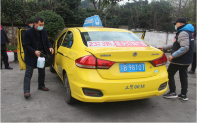 圖二 公司為一線(xiàn)駕駛員發(fā)放口罩、消毒液等防疫物資 三、加強(qiáng)對(duì)各站點(diǎn)和一線(xiàn)巡查督導(dǎo) 公司管理人員全力做好對(duì)本公司運(yùn)營(yíng)出租車(chē)的消毒、司機(jī)自我防護(hù)情況的督導(dǎo)檢查和體溫檢測(cè)等工作。同時(shí),公司管理人員分組包片到車(chē)站、碼頭、商圈等運(yùn)營(yíng)一線(xiàn),督導(dǎo)所屬巡游出租車(chē)疫情防控落實(shí)情況,凡司機(jī)未戴口罩、車(chē)輛未消毒的一律立即停運(yùn)整改,駕駛員發(fā)現(xiàn)乘客拒不戴口罩、健康碼異常、不主動(dòng)配合的不得為其提供乘車(chē)服務(wù)。