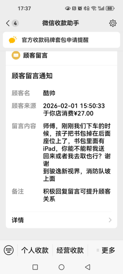 發(fā)表時間:2026-02-02 11:43作者:徐偉來源:公運 2026年2月1日下午,重慶“雷鋒的士”志愿服務(wù)隊公運支隊的雷鋒隊員鄧雙武,用實際行動再次詮釋了“雷鋒精神”,為城市增添了一抹溫暖亮色。 15點35分,鄧雙武在重慶西站搭載了爺孫三人前往石坪橋峻逸新視界,并于15點52分安全送達。他像往常一樣,細心提醒乘客帶好隨身物品后駕車離開。 隨后,鄧雙武又拉到了第二位乘客——一位美女。16點16分左右,美女上車后發(fā)現(xiàn)后排有個書包,便告知了鄧雙武。鄧雙武接過書包,發(fā)現(xiàn)里面有個疑似平板的物品,通過查看微信收款平臺信息,得知乘客留言包內(nèi)有iPhone和電話手表。他立即請美女乘客將自己的電話號碼發(fā)給失主,方便聯(lián)系。 美女乘客下車后,鄧雙武通過失主留下的電話號碼迅速聯(lián)系上對方。此時,失主已在石坪橋派出所報案。鄧雙武安慰他們不要著急,并表示馬上將書包送過去。到達石坪橋派出所后,鄧雙武了解到是小孩不小心把書包遺落在了車上。 之后,鄧雙武還免費將失主一家送回峻逸新視界。途中,家長表示要回去好好教育孩子,鄧雙武貼心勸慰:“別打罵孩子,好好說說就行?!币宦飞?,失主對鄧雙武感激不已,鄧雙武則真誠回應(yīng):“只要是遺失在我們雷鋒車上,都會找回的。”