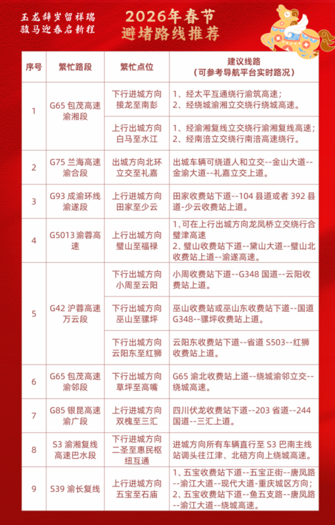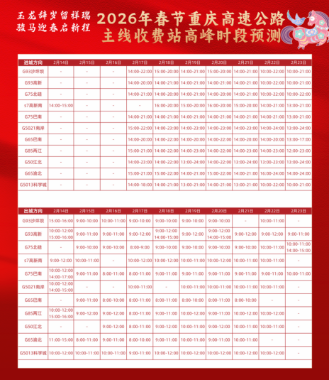 發(fā)表時(shí)間:2026-02-10 15:45作者:李嘉男來源:協(xié)會(huì) 2月7日,重慶高速集團(tuán)發(fā)布重慶高速公路2026年春節(jié)出行服務(wù)指南,明確假期高速通行政策、車流預(yù)判及避堵提示。同時(shí),結(jié)合春運(yùn)期間出租車營運(yùn)特點(diǎn),針對(duì)駕駛員如何避堵增效、規(guī)范營運(yùn),行業(yè)有關(guān)部門梳理了專屬出行及業(yè)務(wù)開展建議,助力出租車駕駛員平安有序跑好春運(yùn)業(yè)務(wù),兼顧服務(wù)質(zhì)量與營運(yùn)效益。 2026年春節(jié)假期為2月15日至23日,共9天。在此期間高速公路七座以下(含七座)小車免費(fèi)通行,時(shí)間段為2月15日0:00至2月23日24:00,免費(fèi)通行期間不發(fā)卡、不收費(fèi),ETC車道正常通行,人工車道實(shí)行抬桿放行。 綜合分析,預(yù)計(jì)2026年春節(jié)假期,重慶高速全路網(wǎng)車流量約1905萬輛次,日均約211.7萬輛次,同比上漲1.5%,較平日增長約123.2%。其中,預(yù)計(jì)2月22日(正月初六)單日車流最高,預(yù)計(jì)達(dá)242萬輛次,當(dāng)日將迎來返程出行高峰,高速及周邊城區(qū)道路擁堵概率顯著上升。 預(yù)計(jì)車流量較大的收費(fèi)站是:G5013科學(xué)城、G50江北、G93高新、G5021南岸、G65巴南、開州、G75巴南、G85兩江、G93沙坪壩、G65渝北;車流量較大的省界通道是渝蓉路G5013大足、渝鄰路草壩場(chǎng)、武合路興山。這些站點(diǎn)周邊及連接路段,將成為春運(yùn)期間車流密集區(qū)域,出租車駕駛員需重點(diǎn)避開。 此外,部分景區(qū)臨近收費(fèi)站流量增長明顯,預(yù)計(jì)濯水收費(fèi)站(濯水古鎮(zhèn))較平日增長超400%,文鳳收費(fèi)站(金佛山景區(qū))較平日增長超300%,河源站和大歇站(黃水景區(qū))較平日增長超170%和300%,龍駒收費(fèi)站(湖北利川蘇馬蕩景區(qū))較平日增長超240%,武隆收費(fèi)站(仙女山景區(qū))較平日增長超200%,四面山收費(fèi)站(四面山景區(qū))較平日增長超200%,夔門、桃花源、大足東收費(fèi)站較平日漲幅超150%。景區(qū)周邊車流激增將直接影響周邊城區(qū)道路通行,給出租車營運(yùn)帶來挑戰(zhàn)。 重慶高速梳理了節(jié)日期間易擁堵路段及避堵線路,公眾在出行游玩前可通過重慶高速官方公眾號(hào)、微博等渠道查詢參考。春節(jié)期間,預(yù)計(jì)服務(wù)區(qū)車流較大的是武隆、圍龍、大足石刻、靜觀、墊江、古路、梁平、潼南、復(fù)盛、忠州等服務(wù)區(qū),途經(jīng)這些服務(wù)區(qū)的車輛需合理安排時(shí)間,提前規(guī)劃補(bǔ)給,盡量錯(cuò)峰出行。 針對(duì)春運(yùn)期間出租車駕駛員避堵跑業(yè)務(wù)的需求,結(jié)合本次高速出行指南及重慶交通執(zhí)法部門相關(guān)提示,特別給出以下建議,助力駕駛員高效營運(yùn)、安全出行: 一是精準(zhǔn)避堵,優(yōu)化營運(yùn)路線。駕駛員需重點(diǎn)避開高速擁堵收費(fèi)站連接路段及景區(qū)周邊擁堵區(qū)域,如G50江北、G65巴南等收費(fèi)站周邊道路,以及洪崖洞、李子壩、磁器口等熱門景點(diǎn)周邊路段,這些區(qū)域在15時(shí)至23時(shí)易出現(xiàn)車流、人流聚集擁堵,建議繞行相鄰支路或選擇非高峰時(shí)段前往。同時(shí),可借助導(dǎo)航實(shí)時(shí)關(guān)注路況,優(yōu)先選擇高速避堵線路對(duì)應(yīng)的城區(qū)銜接道路,避開武隆、復(fù)盛等大流量服務(wù)區(qū)周邊的銜接路段,減少路上滯留時(shí)間。 二是錯(cuò)峰營運(yùn),把握業(yè)務(wù)高峰。結(jié)合春運(yùn)車流規(guī)律,合理調(diào)整營運(yùn)時(shí)間:節(jié)前(2月14日-2月15日)可重點(diǎn)布局火車站、高鐵站、機(jī)場(chǎng)等交通樞紐,承接返鄉(xiāng)客流,避開17時(shí)至19時(shí)的餐飲聚集地出行高峰;節(jié)中(2月16日-2月21日)可避開景區(qū)周邊高峰時(shí)段,轉(zhuǎn)向居民區(qū)、中小型商圈等區(qū)域,兼顧居民出行需求,也可嘗試周邊區(qū)縣短途單,避開主城核心擁堵路段;節(jié)后(2月22日-2月23日)返程高峰期間,重點(diǎn)關(guān)注交通樞紐周邊,同時(shí)避開高速免費(fèi)通行結(jié)束前的車流高峰,提前規(guī)劃好樞紐周邊的??奎c(diǎn)位,按規(guī)定有序攬客,不隨意占道。 三是規(guī)范營運(yùn),筑牢安全底線。春運(yùn)期間,交通執(zhí)法部門將加強(qiáng)重點(diǎn)區(qū)域執(zhí)法檢查,嚴(yán)查違規(guī)攬客、議價(jià)、拒載等行為,駕駛員需嚴(yán)格規(guī)范營運(yùn),主動(dòng)出具發(fā)票,杜絕“轉(zhuǎn)花車”等違規(guī)行為。同時(shí),每日出車前需全面檢查車輛性能,重點(diǎn)核查制動(dòng)、燈光、雨刮器及滅火器等設(shè)施,杜絕“帶病車輛”上路,行車中不接手持電話、不隨意變道,連續(xù)駕駛不超過4小時(shí),避免疲勞駕駛,途經(jīng)濕滑路段或擁堵路段時(shí)減速慢行,保障自身與乘客安全。 四是便民服務(wù),提升業(yè)務(wù)口碑。春運(yùn)期間,“雷鋒的士”等應(yīng)急運(yùn)力梯隊(duì)將在交通樞紐全天候待命,駕駛員可積極配合行業(yè)調(diào)度,助力打通旅客回家“最后一公里”。同時(shí),主動(dòng)為乘客提供便捷服務(wù),如告知高速免費(fèi)通行政策、景區(qū)出行避堵提示等,妥善提醒乘客保管好隨身物品,下車時(shí)主動(dòng)提示索要乘車票據(jù),提升服務(wù)質(zhì)量,借助良好口碑積累回頭客,同時(shí)可