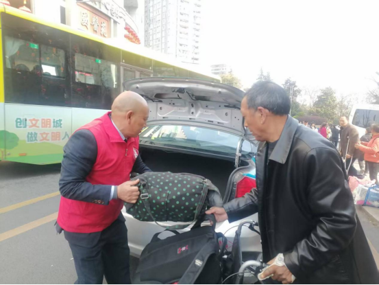 圖為:重慶“雷鋒的士.紅巖先鋒隊(duì)”第七黨小組萬(wàn)州李育明正在幫乘客芳行李。 |