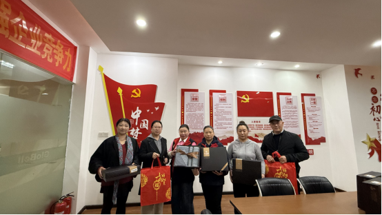 圖為工會(huì)羅主席、黨支部聶書記、客運(yùn)宋經(jīng)理為女駕駛員們送上節(jié)日的禮物