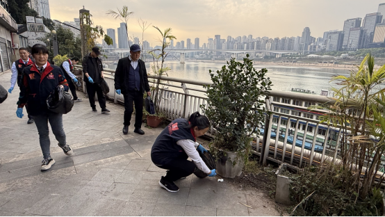 圖為嘉濱路濱江沿線垃圾清撿現(xiàn)場(chǎng)(二) 在清撿洪崖洞碼頭一段的垃圾時(shí),正逢一群外地游客從碼頭拾階而上??匆娭驹刚邆儽Wo(hù)環(huán)境清撿垃圾的行動(dòng),紛紛豎起大拇指,同時(shí)提醒身邊小孩,文明旅游,不要亂扔垃圾。行動(dòng)一小步,文明一大步。看到我們的行動(dòng)得到認(rèn)可,志愿者們非常開心,仿佛一瞬間所有的疲憊都消失殆盡。