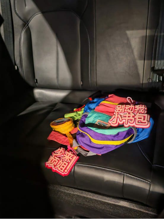 圖為:小朋友掉在車上的書包。