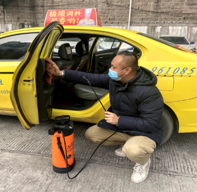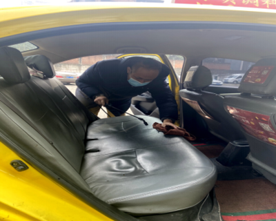 網(wǎng)約車駕駛員在每一趟乘客下車后進行重點部位快速消毒,落實車輛消毒防疫措施。