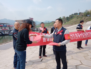 圖為雷鋒隊(duì)員們手持活動(dòng)宣傳條幅在大竹林河岸上。