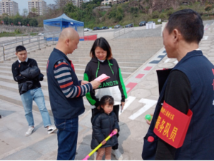 圖為大隊(duì)領(lǐng)導(dǎo)正在活動(dòng)現(xiàn)場(chǎng)為游客發(fā)放《條例》宣傳單和兒童禮品并進(jìn)行宣傳講解。