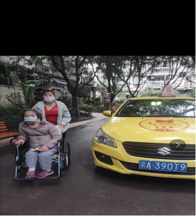 圖一 姜正芳把王婆婆從醫(yī)院接出來 當天上午9點,重慶大嘉出租汽車公司“雷鋒的士”隊員、愛心志愿者姜正芳,駕駛該公司渝A390T9三星雷鋒的士創(chuàng)建車,在收到王婆婆發(fā)出用車需求的消息后,第一個趕到重醫(yī)附二院附近,規(guī)范地把車停好,姜師姐在附二院等待了大約1個小時左右,王婆婆辦完手續(xù)后由醫(yī)院護工推著輪椅從醫(yī)院出來。隨后,姜師姐從護工手里接過輪椅把老人推到車前,然后把老人從輪椅抱上車并幫助老人家系好安全帶,放好輪椅,載著老人,快樂地出發(fā)回家。