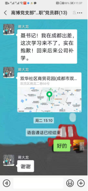 圖為黨員蔣大龍出差途中通過(guò)微信請(qǐng)假報(bào)備 時(shí)刻不忘學(xué)黨史,保持初心跟黨走!高博黨支部將繼續(xù)組織全體黨員,深入開(kāi)展學(xué)習(xí)黨史系列活動(dòng),以學(xué)黨史深化悟思想,以悟思想促進(jìn)辦實(shí)事,以黨史學(xué)習(xí)教育的成效慶祝偉大的中國(guó)共產(chǎn)黨成立100周年。 (文/圖 羅繼偉) |