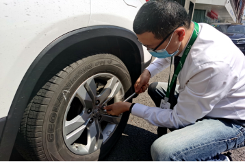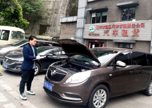 租賃公司工作人員對(duì)節(jié)日租賃車交付客人使用前進(jìn)行例行檢查,確保車況安全。